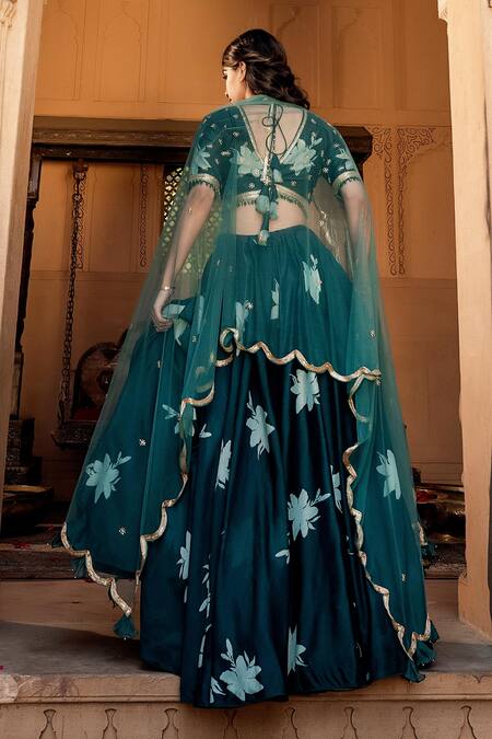 Emerald lehenga featuring all-over printed lily motifs. Paired with an embroidered V-neck blouse with beaded tassels and embroidered tulle net dupatta.