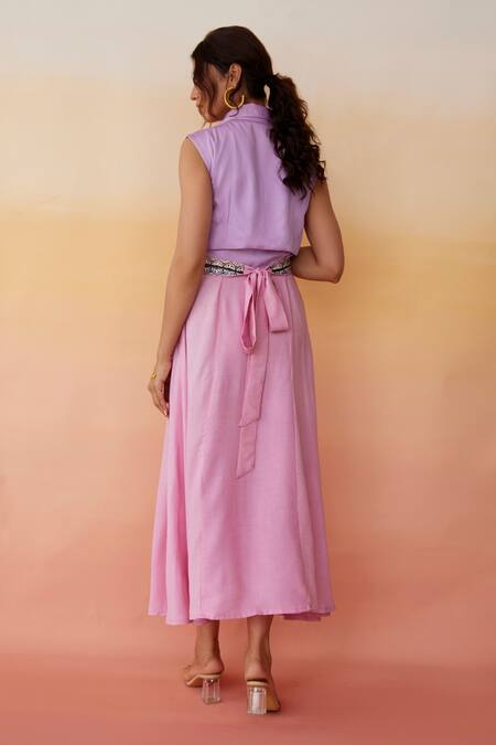 Purple, pink trench dress with double breasted lapel collar and welt pockets. Comes with a hand block print belt.