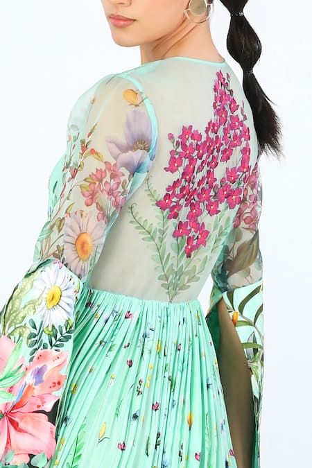 Sequin embellishments on floral patterns, Fit & Flare silhouette, Bell sleeves with floral detailing