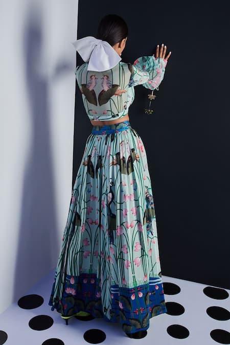 Green crop top with all-over floral motif print, bishop cuff sleeves & tie-up knotted front.
