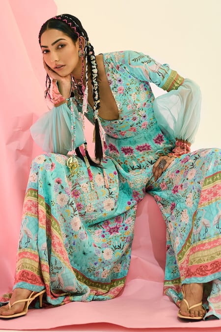 Light turquoise jumpsuit with flared leg, all-over multi colored floral prints & embroidered neckline.