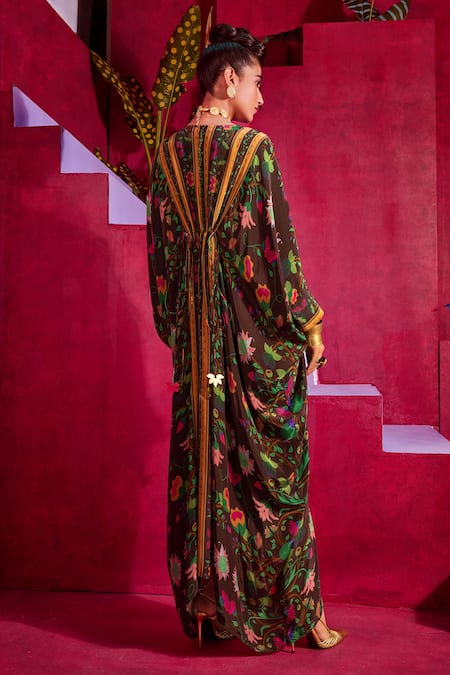 Brown Crepe Floral Print V Neck Gili Kaftan Gown
