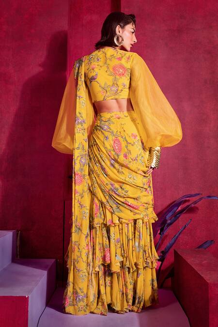 Yellow pre-draped saree with all-over floral print and layered ruffle trim on the hem. Comes with V neck bugle bead embroidered blouse.