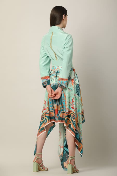 Asymmetrical hemline design, Vibrant floral and paisley motifs, Unique peacock pattern details