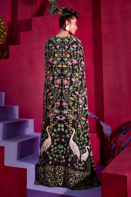 Black cape with all-over floral and bird printed motifs. Comes with blouse and draped skirt.