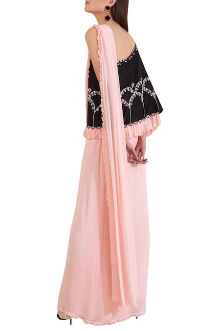 Exhibit effortless glamour in this exquisite dual-hued ensemble. Features a pre-draped baby pink saree, crafted out of luxe fabrics. Enhanced with an attached one-shoulder cape, decked with 3D florals , beads and pearls. This layered cape further flaunts of ruffle and cord detail hemline, enriched with loop trims on the neckline.