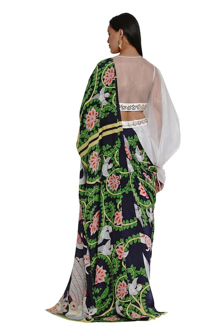 Ivory pant saree with attached navy blue printed drape. Comes with bishop sleeve embellished blouse.