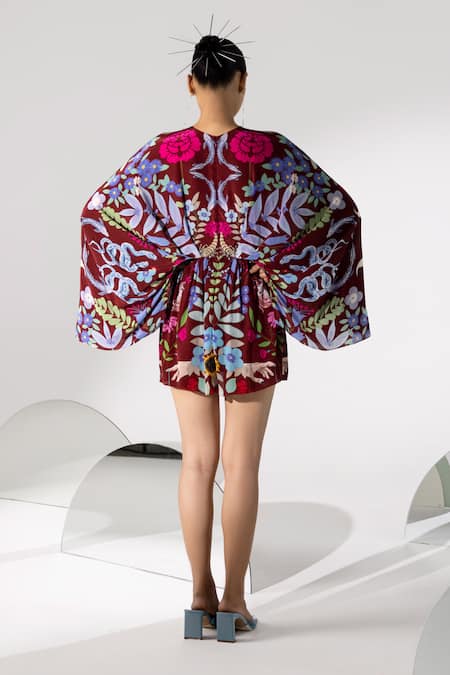 Maroon draped dress with floral, zodiac printed motifs & front-gathers.