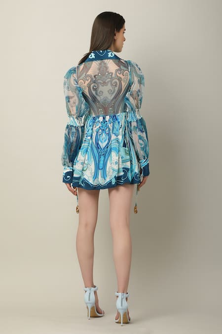 Multicolor dress featuring a notched lapel collar and puffed sleeves. Designed with a paisley print in organza and crepe fabric, it includes a back tassel tie-up and cutwork border.