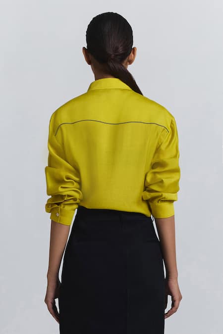 A neon yellow chanderi shirt featuring abstract embroidery on the front.