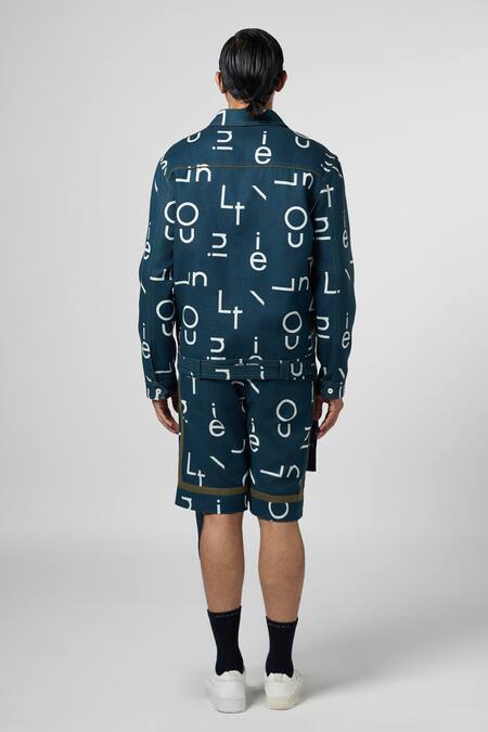 Blue bomber jacket featuring full sleeves with an outline alphabet print