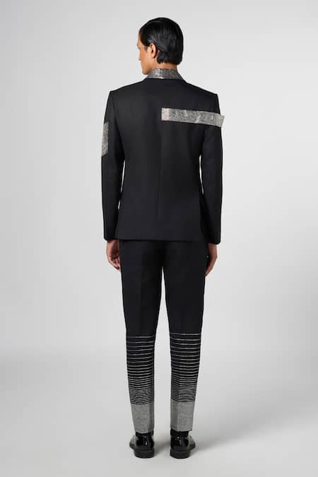Black blazer in matka cotton featuring pitta embroidery with a V neck and full sleeves. The trouser worn by the model is not for sale.