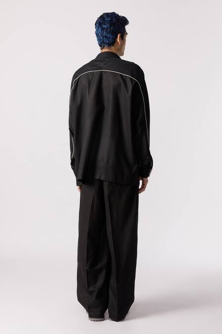 Black oversized shirt featuring silver geometric embroidery with a collar and full sleeves