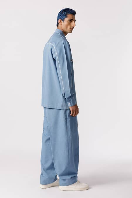 Blue oversized shirt featuring geometric embroidery and front button closure