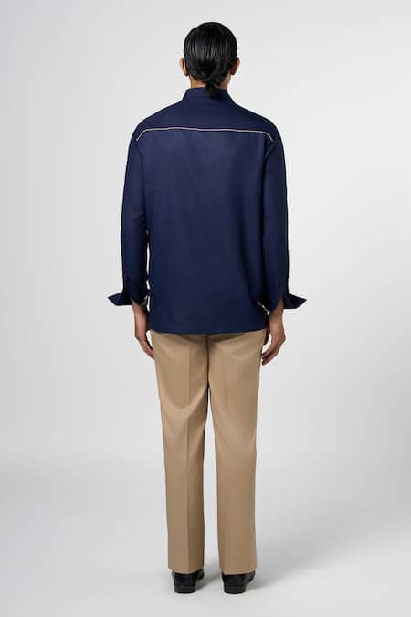 Navy blue button-down shirt featuring leather patchwork details on the front