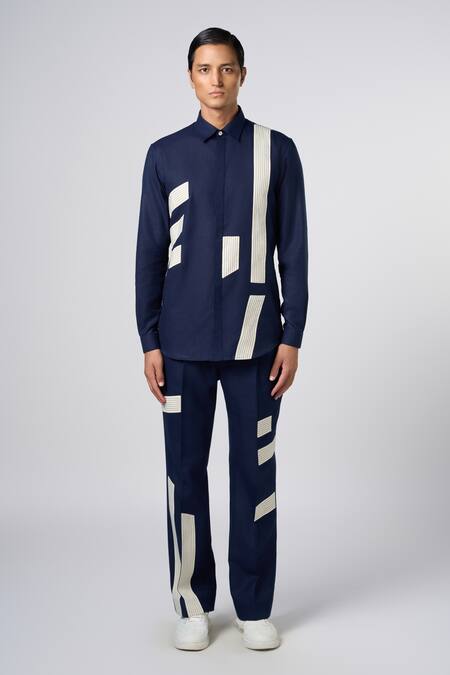 Navy blue pant featuring a contrast panel design with stitch line embroidery
