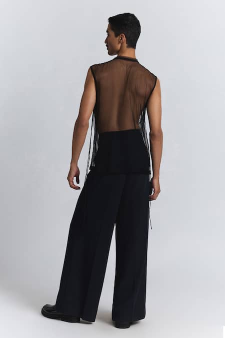 A black vest crafted from mesh fabric, featuring an open-grid silhouette with cording detail.
