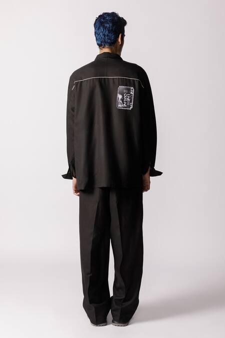 Black oversized shirt featuring abstract printed patchwork with raw edge detailing and contrast piping at the back