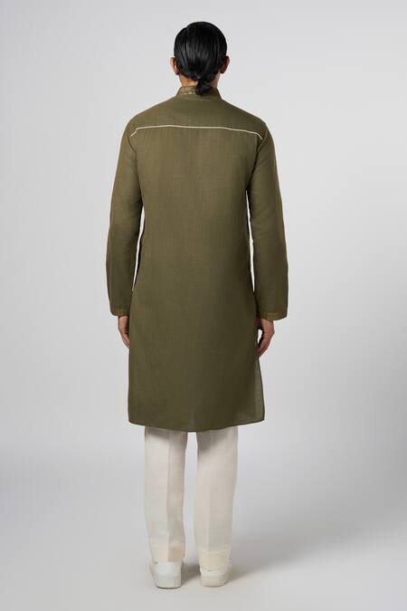 Olive green kurta featuring pitta placement embroidery in a scallop pattern