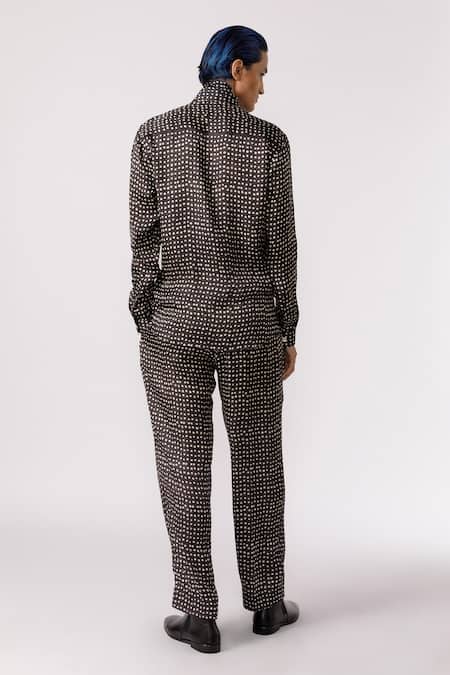 Black bamboo silk shirt featuring a polka dots print and a double collar