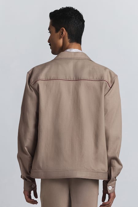A beige denim twill jacket featuring tonal top-stitch embroidery mimicking modular grids, a spread collar, and multiple utility pockets with flap closures.