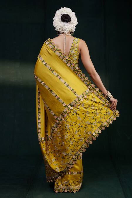 Yellow saree featuring linear floral embroidery with scallop border. Paired with a sleeveless embroidered blouse in raw silk.