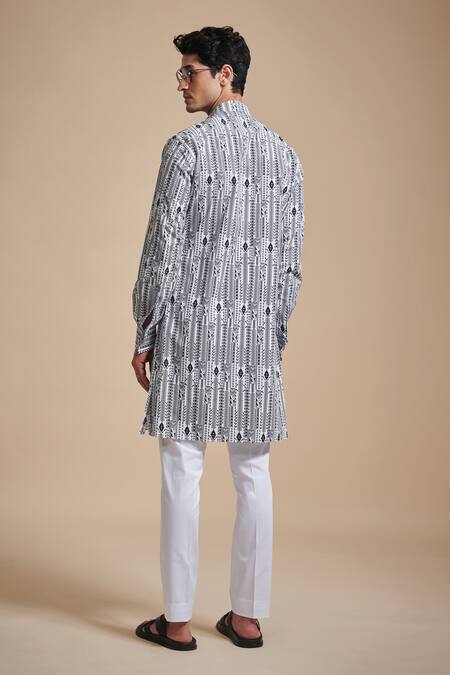 Black kurta with linear print. Paired with off-white cotton pant.