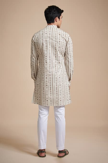 Cream kurta with linear print & mandarin collared neckline. Paired with off-white cotton pant.