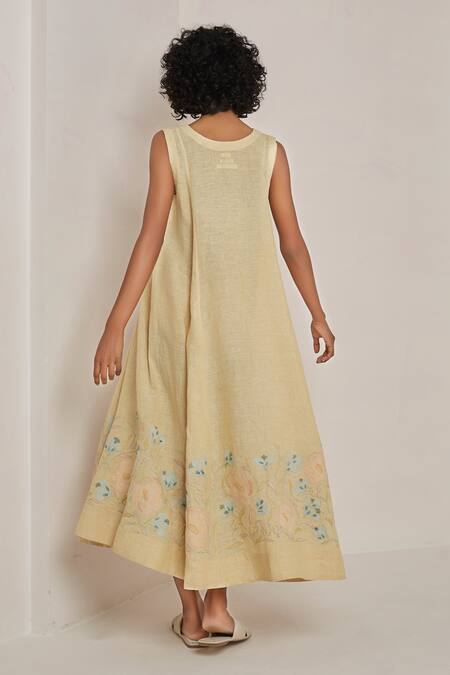 Yellow a-line dress with floral embroidery at the hem and v-neck.