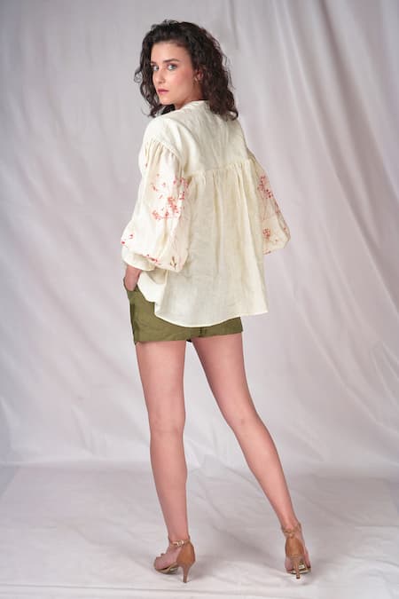 Buy_Seesa_Cream Linen Embroidery Bandeau Neck Collar Top_Online_at_Aza_Fashions