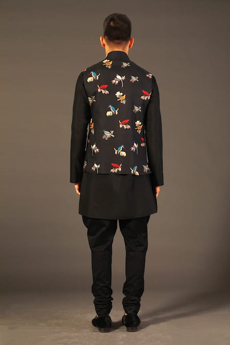 Buy_Rohit Bal_Black Linen, Lining Silk Bird Embroidered Bundi _at_Aza_Fashions