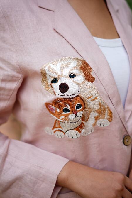 Buy_Linen Bloom_Pink Linen Embroidery Dog And Cat Blazer _at_Aza_Fashions