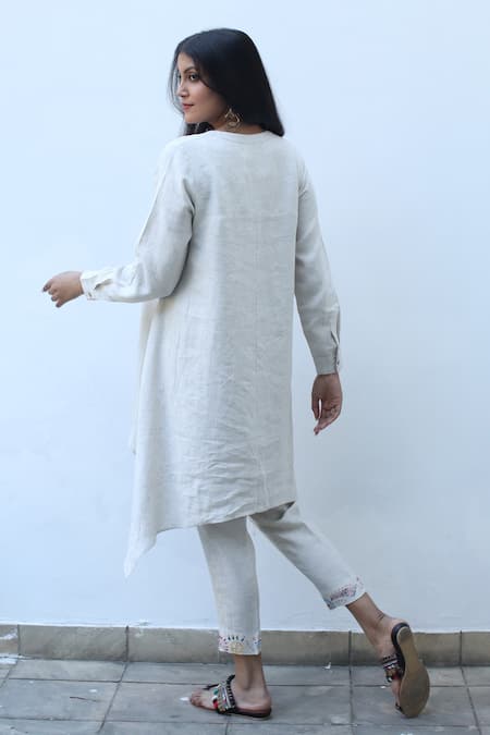 Buy_Linen Bloom_Beige Linen Embroidery Round Neck High Low Hem Tunic _Online_at_Aza_Fashions