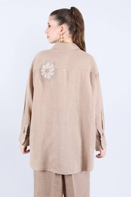 Beige linen shirt featuring floral applique embellished motifs and bead accents. Paired with matching relaxed fit pants.