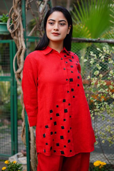 Buy_Linen Bloom_Red Linen Embroidery Collared Box Shirt _Online_at_Aza_Fashions