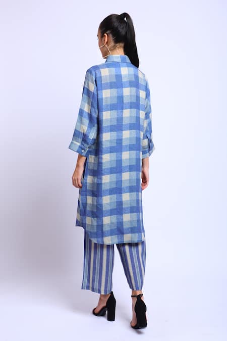 Blue 100% Linen Printed Digital Collared Neck Checkered Tunic