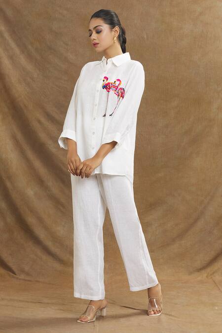 White Linen Embroidery Collared Flamingo Placement Shirt