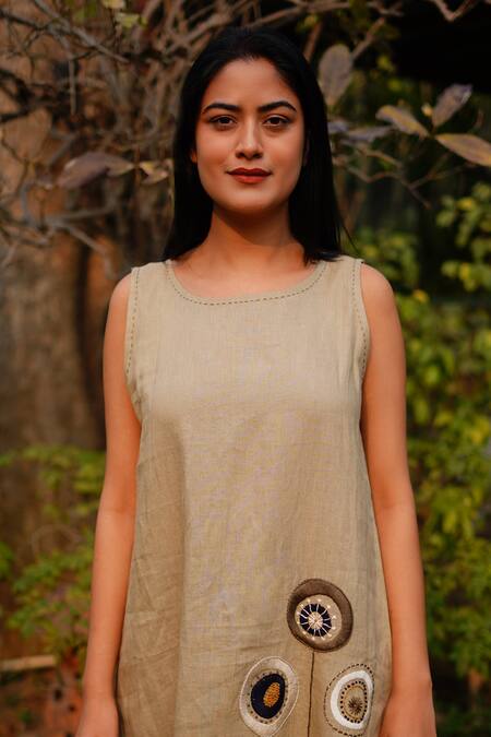 Buy_Linen Bloom_Brown Linen Embroidery Boat Neck Flower Dress _at_Aza_Fashions