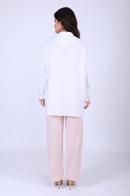 Buy_Linen Bloom_White 100% Linen Thread Work Mandarin Collar Puff Sleeve Tunic _Online_at_Aza_Fashions