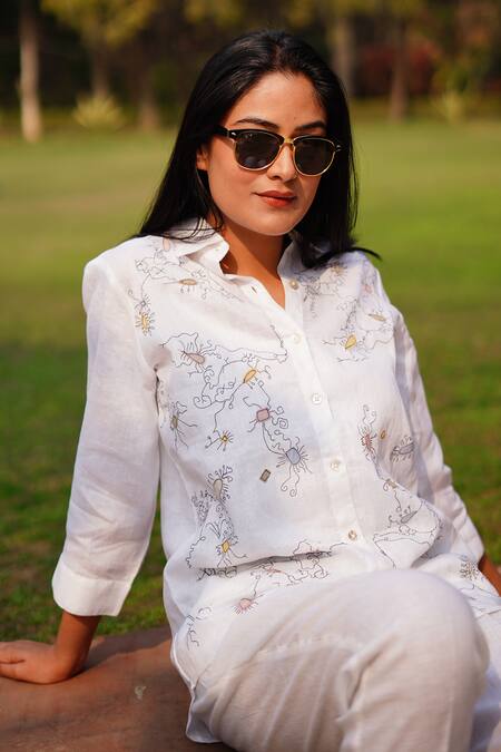 Buy_Linen Bloom_White Linen Embroidery Collared Scribble Shirt _Online_at_Aza_Fashions