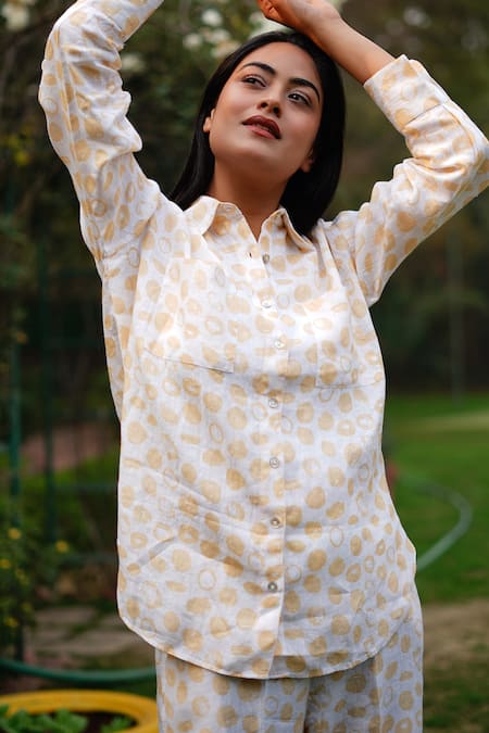 Buy_Linen Bloom_Yellow Linen Collared Polka Dot Print Shirt _Online_at_Aza_Fashions