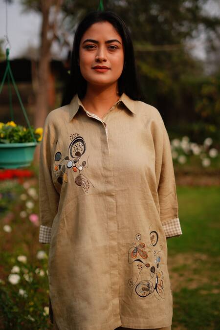 Buy_Linen Bloom_Brown Linen Embroidery Collared Scribble Shirt _at_Aza_Fashions
