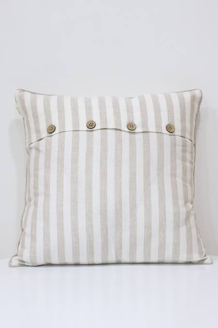 Beige pure linen cushion in square shape, all over contrast stripe pattern & corded edges.