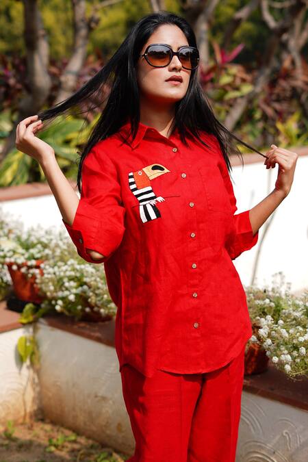 Red Linen Embroidery Collared Toucan Striped Shirt