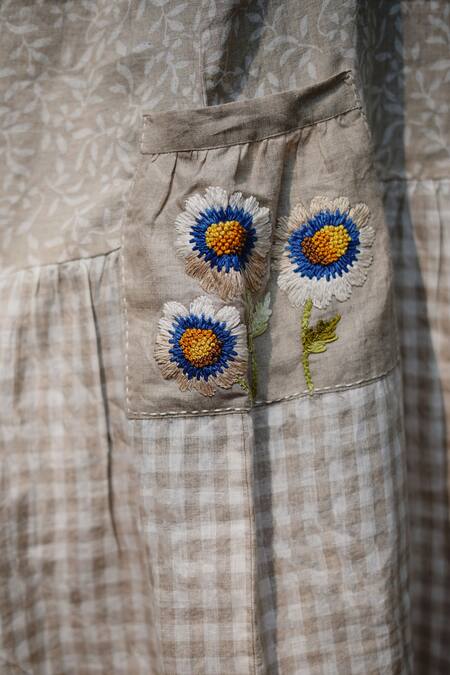 Buy_Linen Bloom_Beige Linen Embroidery Round Neck Vines And Checkered Print Dress _Online_at_Aza_Fashions