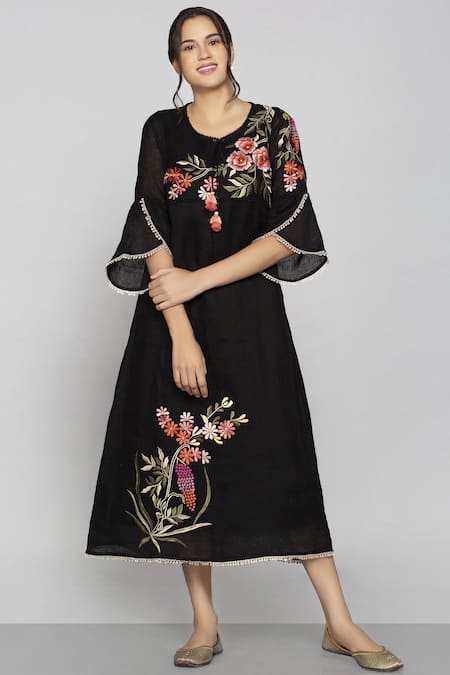 Black midi dress with placement floral motif embroidery & lace trim detail.