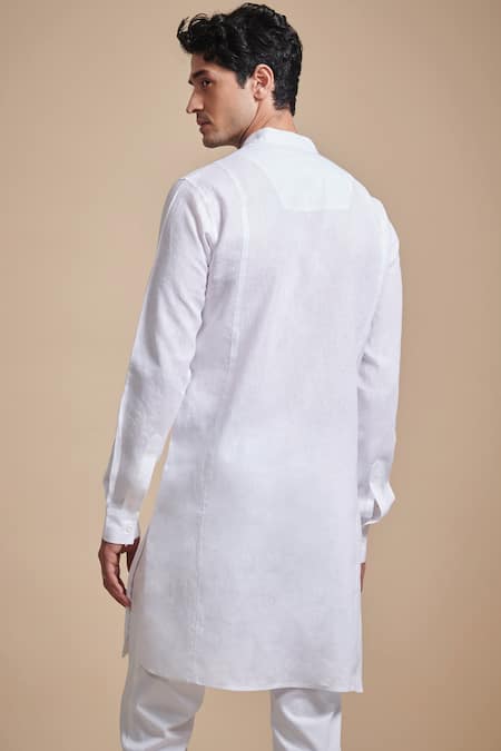 Shop_Raghavendra Rathore Blue_White Linen Mandarin Collar Kurta_at_Aza_Fashions
