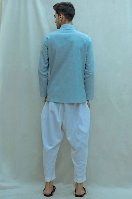 Blue short kurta with asymmetrical front overlap. Comes with matching harem pants.