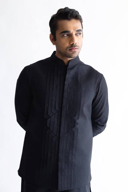 Black linen nehru jacket featuring pleats and geometric motifs