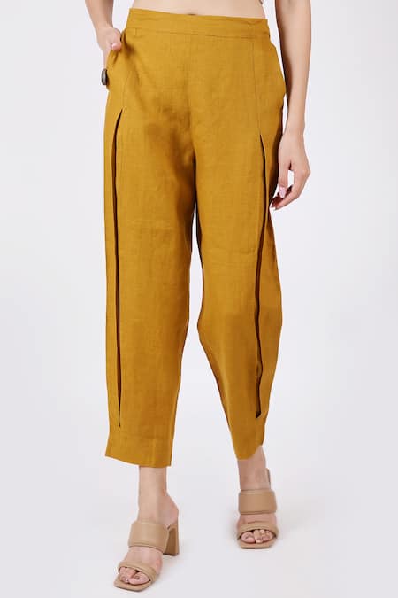 Mustard straight pant in linen fabric base & pleated pattern.